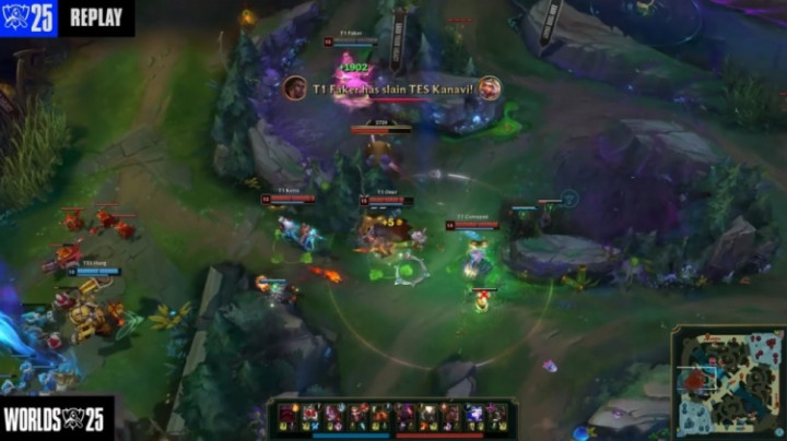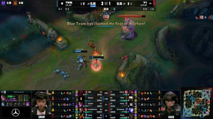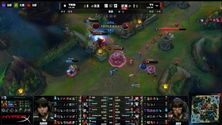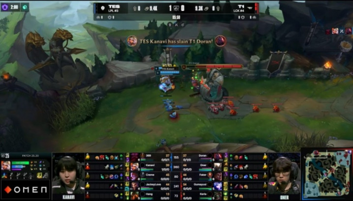 [9:39]Kanavi奇亚娜中路过墙配合Creme阿萝拉开大击杀Faker梅尔,Kanavi吃到一下防御塔伤害,Oner潘森来中闪现戳掉Kanavi大人头。随后TES三人下路越塔强杀小吕布得手,Kanavi奇亚娜拿到人头,但hang泰坦被防御塔击杀被换,双方打出2换2。