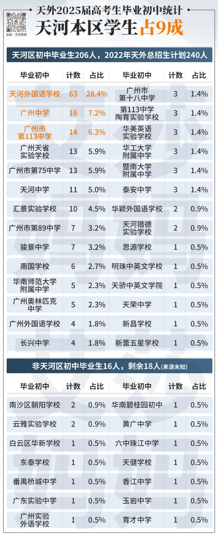 来看下初中生源校。200多个人里面,只有10几个人非天河区初中毕业。基本还是民办初中。