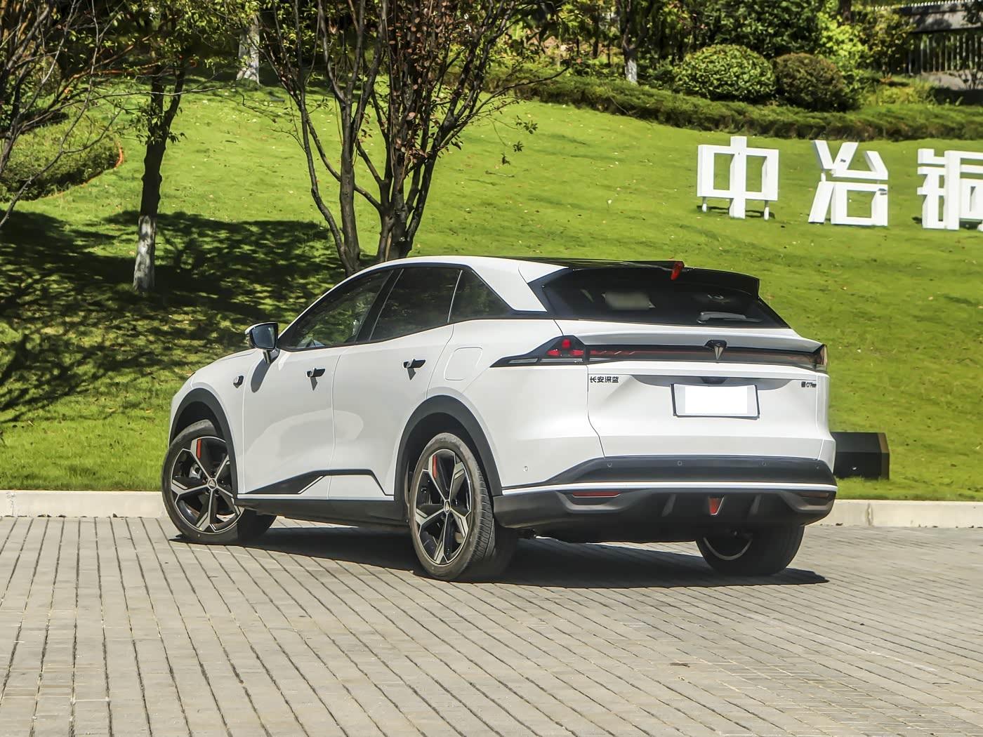 再来看车尾部分,车尾设计延续了深蓝品牌标志性的贯穿式LED灯组,采用立体悬浮式结构配合流水转向灯与呼吸式示宽灯,夜间点亮时如璀璨星河般具有高辨识度。顶置单点式高位刹车灯经过优化设计,显著增强紧急制动时的后车警示效果。后保险杠采用黑色扩散器造型,通过疏导车底气流提升高速行驶稳定性,而车标黑化处理等细节点缀则强化了整车的运动基因。这种将安全功能与美学设计深度融合的尾部造型,既保持了家族化设计语言的连贯性,又通过空气动力学优化实现了形式与功能的完美统一。